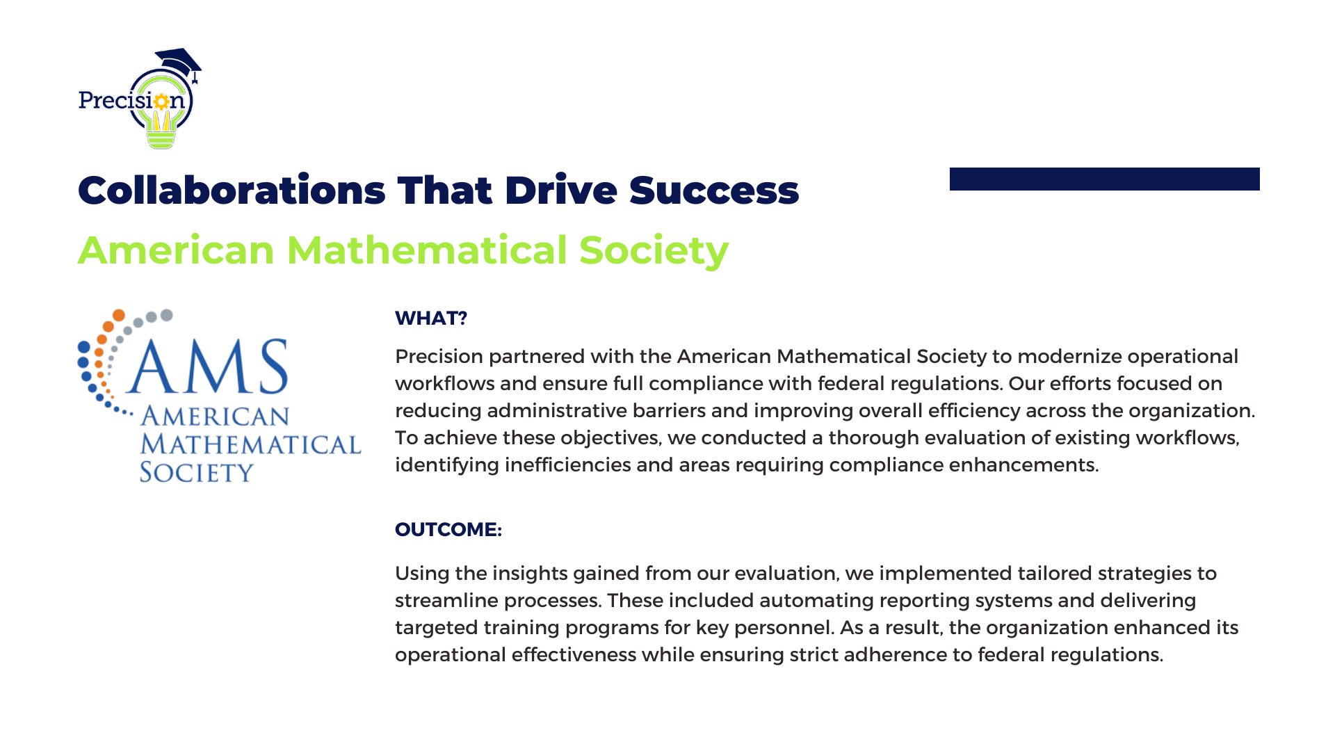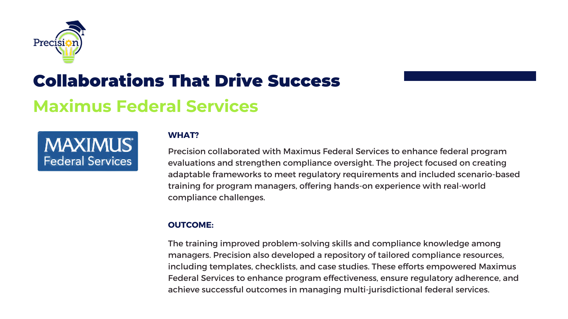 - Project Management & Compliance Support: Achieving a balance between forward-thinking strategies and regulatory adherence sets the stage for effective government contracting. Precision’s team is adept at managing every stage of a project lifecycle—from initial consultation through to detailed regulatory compliance and performance reporting. We specialize in federal and state compliance consulting, ensuring your projects not only meet but exceed the rigorous standards imposed by today’s regulatory environment.