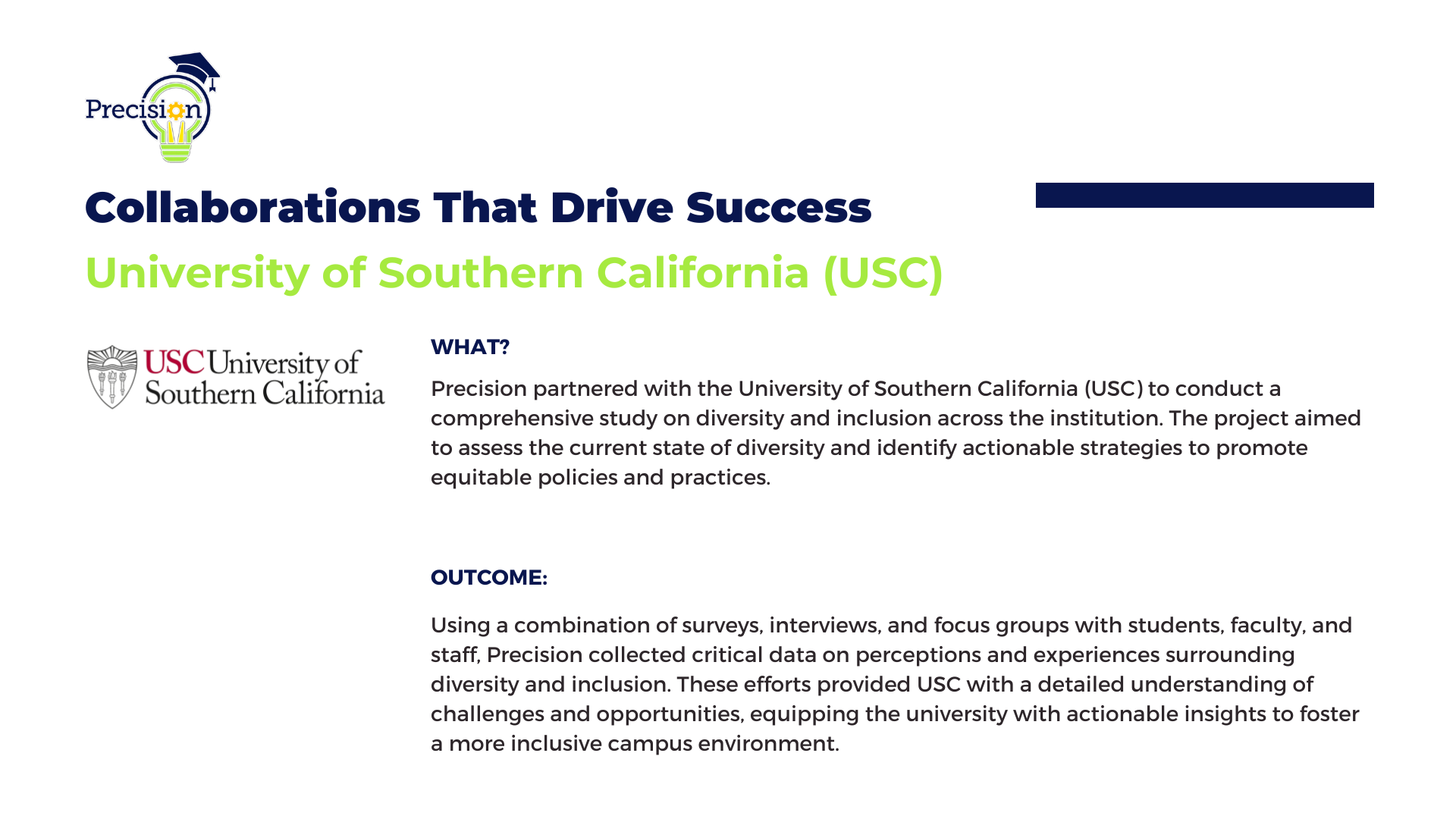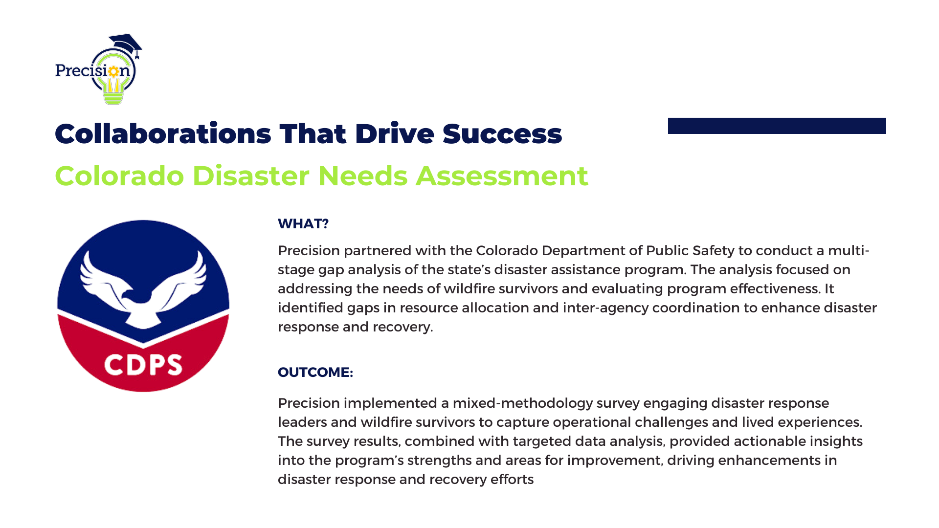 - Survey Design & Qualitative Analysis: In today’s data-driven environment, understanding the human element remains paramount. Precision has a proven track record in conducting stringent qualitative and survey research to capture public sentiment, evaluate policy impacts, and guide program development. We work closely with government agencies to design surveys that reach diverse populations, synthesize qualitative data into actionable insights, and support the creation of data-driven policies aimed at improving community well-being.